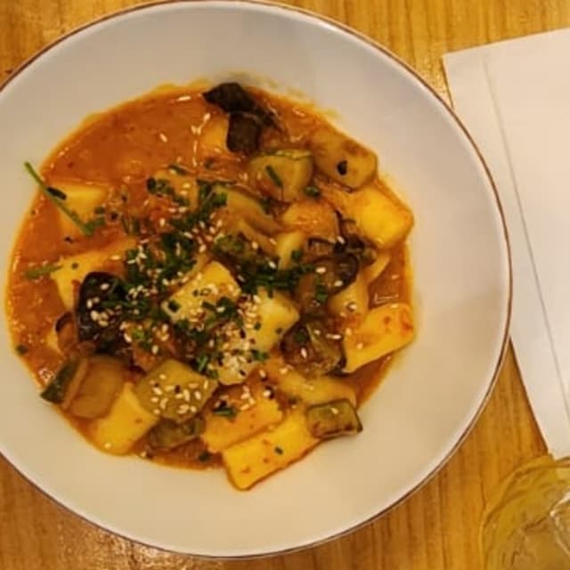 Ñoquis de arroz con pimientos, berenjenas, zucchinis y salsa agripicante. Plato abundante. Me encantaron.