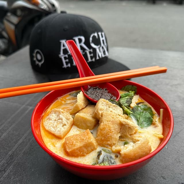 There's this myth that there's no vegan Penang food 🙄 I probably contributed to it by being blissfully unaware of places like this one, hiding in plain sight 😅 This is your traditional kopitiam, without cruelty on the menu. I recommend getting your fix of authentic Penang fare here; my litmus test is whether the auntie opens the conversation in Penang Hokkien. Test passed ☺️ This #spicy dish is what southerners and Singaporeans call #laksa (which in Penang refers to something else). It comes with #tofu, #taupok, #kangkong, #beansprout, and some #mint leaves for aesthetic effect. I normally switch the noodles for #beehoon; they are flexible and will accommodate most requests. #supportlocal #malaysianeats And btw this cost just RM5 😋