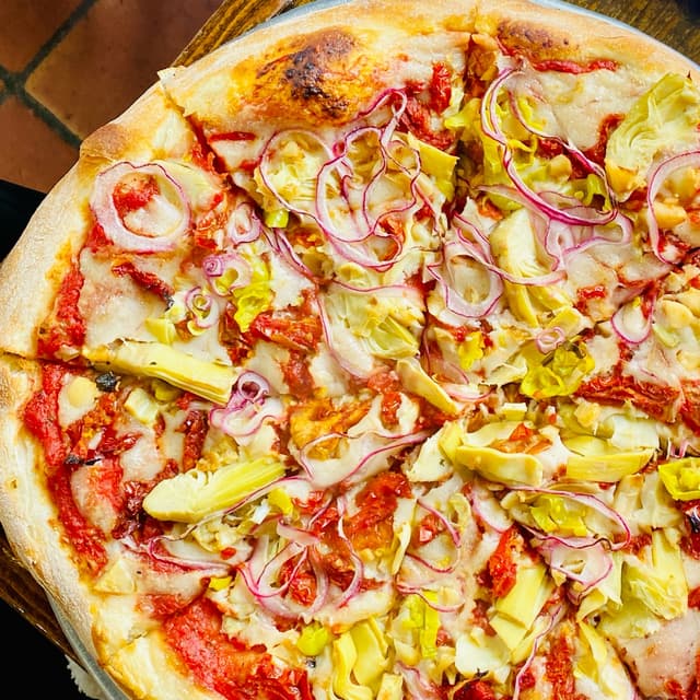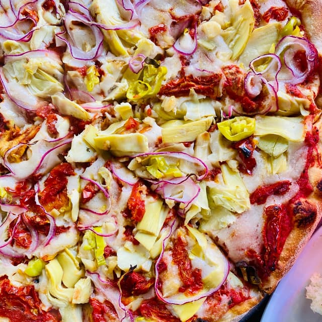 The veggies on this were absolutely incredible! Artichokes, red onions, pepperoncino and garlic over their house red sauce and vegan cashew cheese. The trick with the Miyoko’s cheese is spreading it really thin to get the best results and HMP does that perfectly!