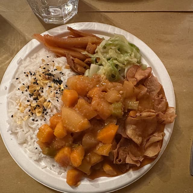 vanimao2 years agoSee TranslationPiatto combinato, con riso, pasta di platano verdure speziate, crema di mais e chips di yucca. Davvero una scoperta, ottimo . Unica cosa non specificata nel menù, il piatto è molto piccante.0