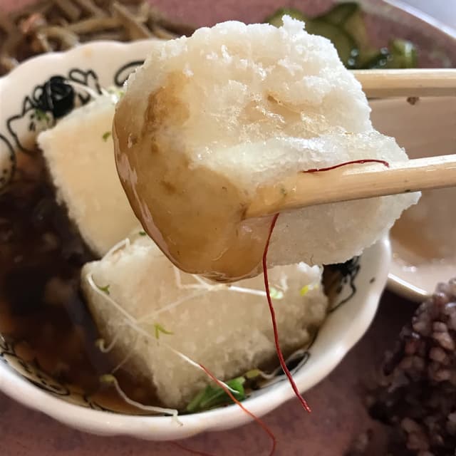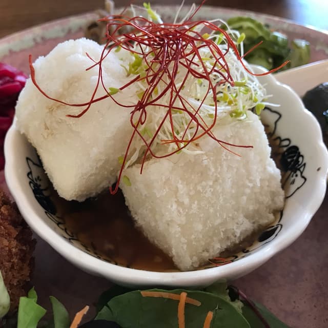 Here, the Teishoku meal set is a random assortment of pickles and other menu elements that come surrounding your main plate choice. These seem to change seasonally, so to see an example of it the owner had to whip out his phone and show me. The only vegan Teishoku main dish for the day I visited was the Agedashi Tofu, described as ‘Lightly fried tofu & braised eggplant served in an umami broth’.