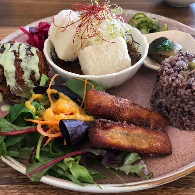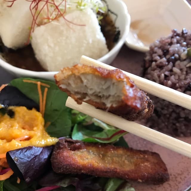 This came in a little cat-covered bowl in the centre of the plate, served with micro sprouts and chilli threads. There were just three big cubes of silken tofu fried in a crispy white batter. The umami broth was not liquid, but weirdly gelatinous having been thickened with some sort of starch with the braised eggplant pieces suspended in it. I feel like the “broth” or rather gravy was a bit muted and could have been more flavourful, especially since the bland tofu needs it.