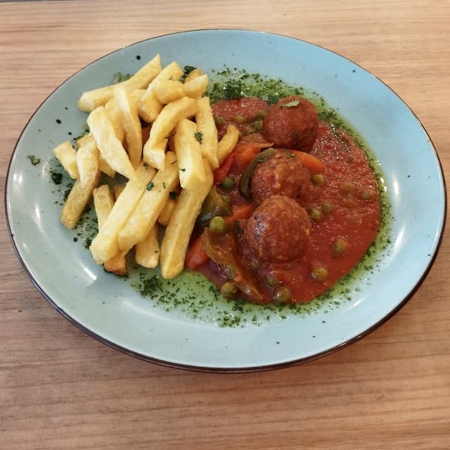 Vienen con patatas a elegir entre fritas o cocidas, la salsa lleva guisantes, zanahorias y sabía sobre todo a tomate y ajo. Las albóndigas son de quinoa.