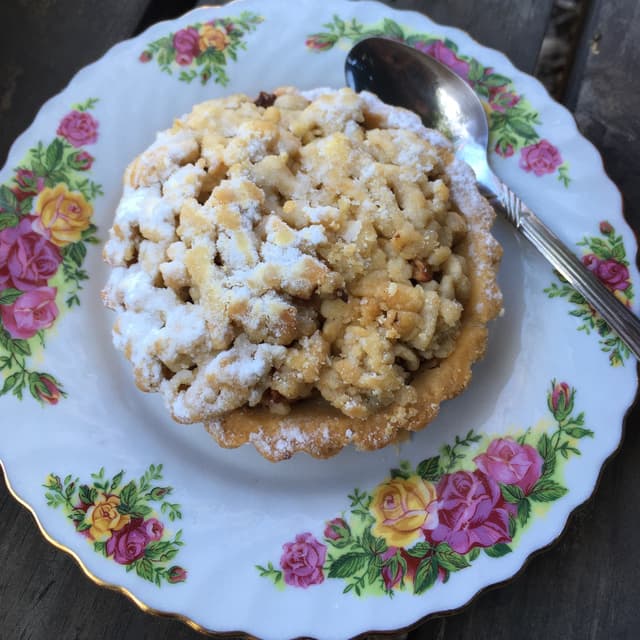 Delicious apple crumble and perfect portion size as well! The crust was crunchy and my fork had to battle just enough to get through! The apples were cinnamony and soft and sticky! So delicious!!!!! 🍎