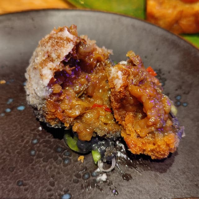 Croquetas de arroz con berenjena “Yu-Xiang”, acompañadas por una salsa a base de berenjena. Por 8,00 €