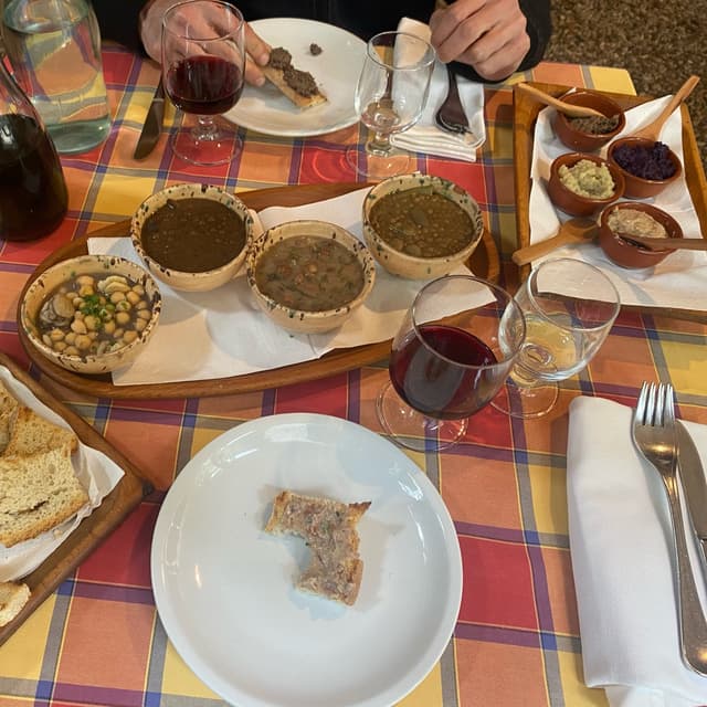 Assaggio di 4 zuppe. Le migliori ceci e castagne e lenticchie e funghi. Hanno un menù vegan a parte.