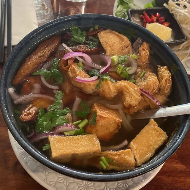 The service was so fast and this was quite a big bowl. You can choose between "beef" or "chicken". I chose chicken. I would have preferred one of those special soup spoons you get at some Asian restaurants. It takes forever trying to drink the liquid at the bottom with a normal spoon. Unless you drink from the bowl.. 😬