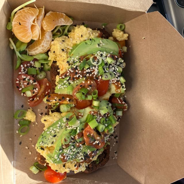 Delicious, unique take on avocado toast! This savory toast featured JUST egg, Miyoko’s herbed butter, scallions, cherry tomatoes, spicy sauce, and some juicy clementines on the side. I will definitely get this again! 🥑