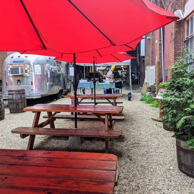 We had some amazing pizza last weekend from the Vegan Pizza Land food truck. We live near Northampton, Massachusetts, and this area used to be all paper mills along the river, but now they're all abandoned. Some of the buildings have been turned into artist's lofts, dance studios, microbreweries, etc. The pizza truck is parked in the alley behind the Abandoned Building Brewery. It's just an alley, but they've made it really cute with picnic tables, umbrellas, and big barrel pots full of flowers. You can sit in the back, order pizza, grab some beer inside, or sit inside and get pizza brought to your table from the truck. The pizza itself was some of the best I've had. The crust was thin and crispy, and it held up well to the toppings. The pictures don't do it justice. We tried two pizzas, and my favorite was the one topped with housemade cashew cheese, shishito peppers, crispy tofu bacon, (which was delicious), and some Chipotle crema. We also got some salads, which weren't great, but we're definitely going back for more pizza! #veganpizza