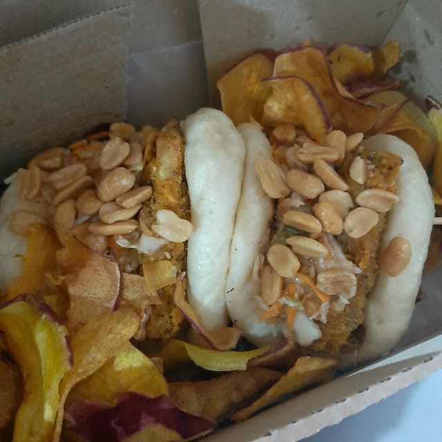 Pan al vapor súper esponjoso y rico, tofu apanado riquísimo y condimentos, que algunos no me gustaron tanto. Trae chips de batata