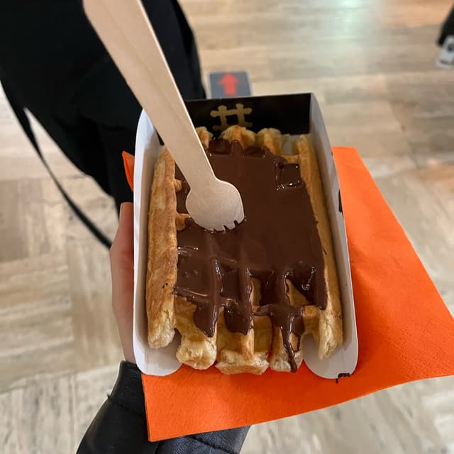 classico waffle con topping di crema al cioccolato buonissimo e che non poteva assolutamente mancare in una gita a bruxelles! il posto fa solo waffle vegani e ha un'ampia scelta per il topping. super consigliato!