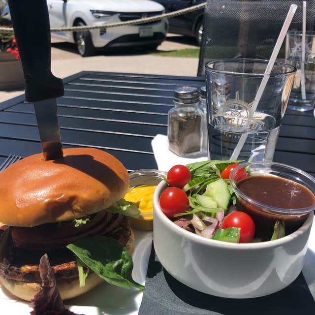 #reviewwithaview The #BlackBeanBurger party was topped with #PicodeGallo, #garlicmayo, #lettuce, #tomato, #onion, and #pickles. The side #housesalad was very fresh and the #tomatoea were so flavourful!! I asked for #oilandvinegardressing to veganize it. A nice patio treat on a gorgeous day at the #beach of #lakehuron.