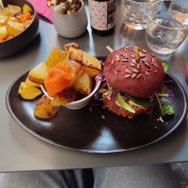 Panino artigianale con semi di girasole, hamburger proteico a base di soia, insalata, cavolo rosso, pomodoro e maionese vegetale, accompagnato da patate e patate dolci al forno. Sapore e aspetto ottimi, perfetto per chi non ama i burger che imitano il gusto della carne. Rapporto qualità-prezzo più che ottimo, mi ha saziata nonostante le dimensioni non siano eccessive e sia molto digeribile.
