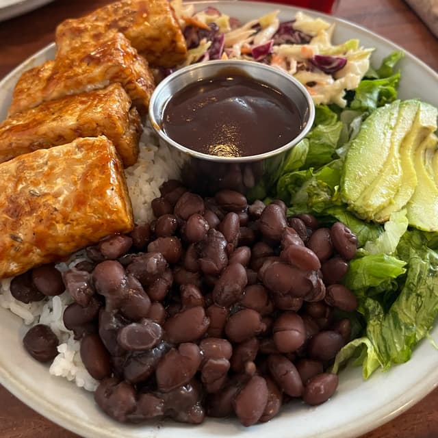 Creo que no soy fan de los bowls de este restaurante, saben bien pero se ven más ricos de lo que saben 😅 Este llevaba arroz blanco, frijoles, lechuga, aguacate, ensalada de col 🥬 y tiritas de #tempeh a la BBQ, las cuales no estaban muy ricas, me parece que les falta marinar mejor el tempeh porque bien preparado es una delicia. Ojalá lo mejoren porque en sí el bowl es muy nutritivo, solo le falta estar más sabroso 🤩😁 #veganbowl #tempehlover #ifitsnotveganitsnotfood #ifitsnotveganitsnotethical