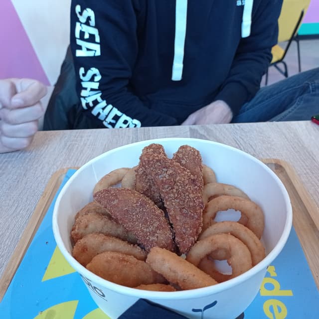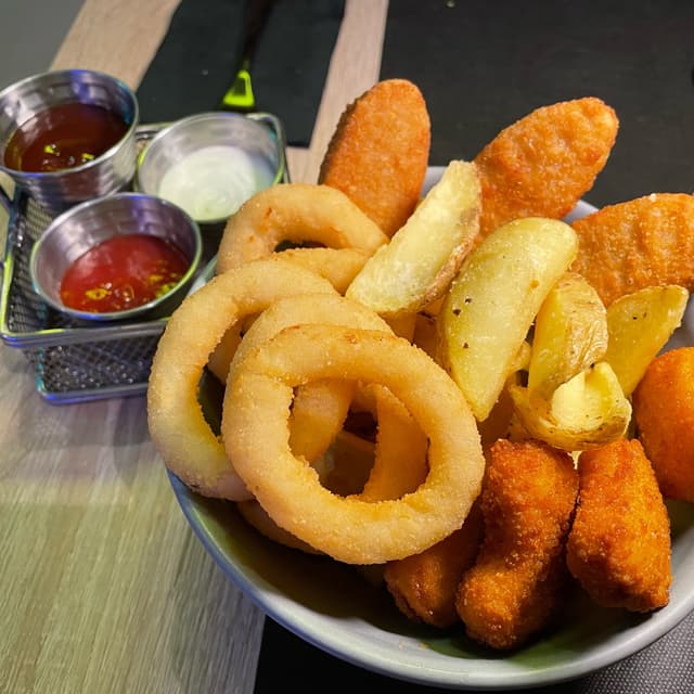 Patatine, nuggets (heura), chicken tender e anelli di cipolla, serviti con ketchup e salsa barbecue. Ottimo!