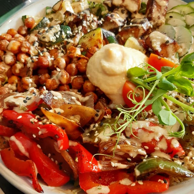 Delicious, we always enjoy coming to PureVegan! Roasted chickpeas, leaves, quinoa, sauteed tofu and veggies :)