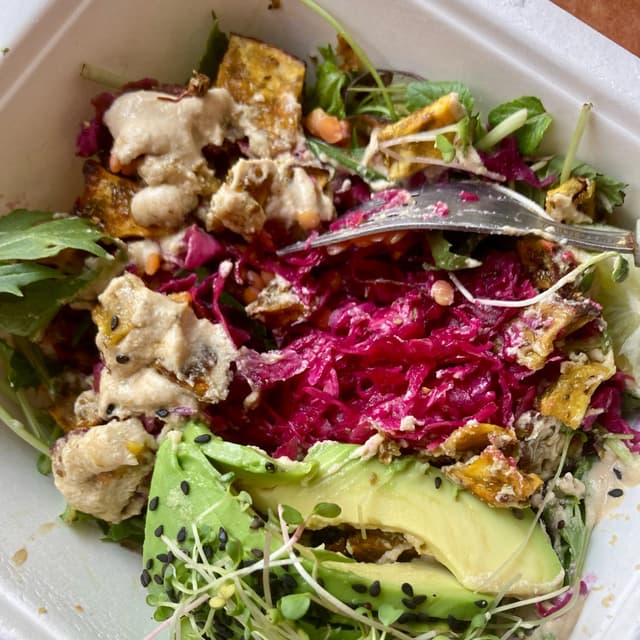 Mix verde, camotes asados, lentejas rojas, fermentado de repollo, palta, sésamo negro, acompañado de dressing de cajú 😍