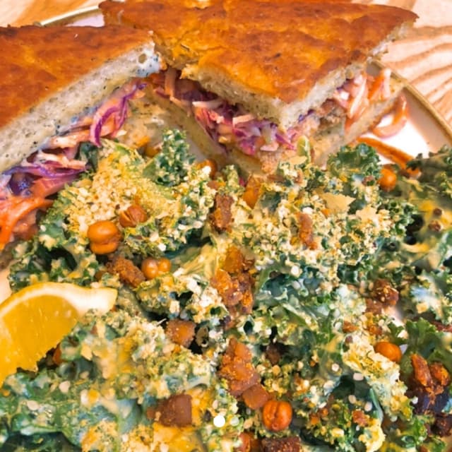 Slightly spicy, this hot, crispy tofu sandwich served with homemade toasted focaccia bread is delicious! One of the best vegan kale Caesar salads anywhere, generous with the dressing and “Parmesan”, and a perfect crunch from the toasted chickpeas makes this a very filling and savoury meal! There are usually 2 extremely delicious kombucha flavours on tap and go great with this dish!