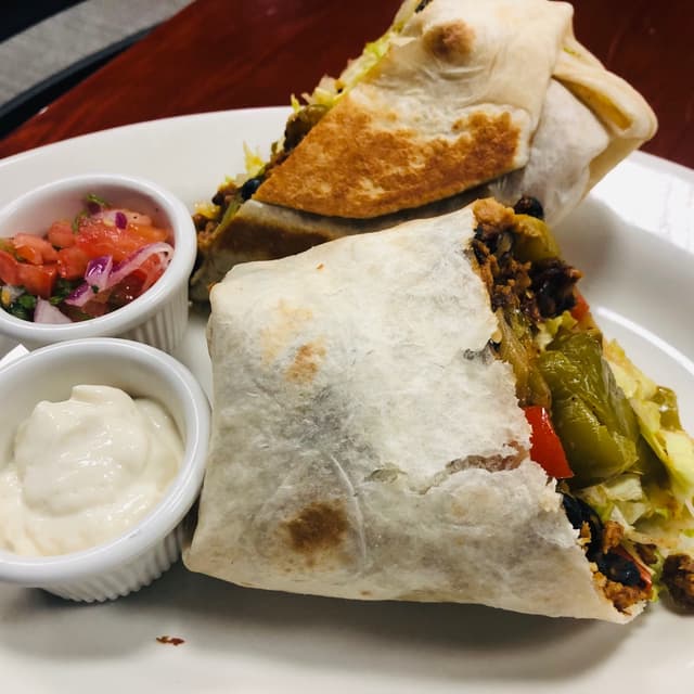 Lonica Lee Kufner5 years agoSee TranslationSeitan chorizo, black beans, sauteed peppers and onions, lettuce, sour cream, creamy queso.0