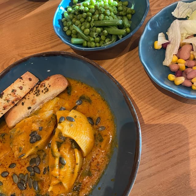 There’s a decent selection of vegan options on this menu and I love butternut squash and spinach. Not sure where the spinach is though! Fairly tasty, though I actually preferred the free salad from the buffet! The five bean and sweetcorn were lovely! And they had vegan spread for the tasty bread rolls :)