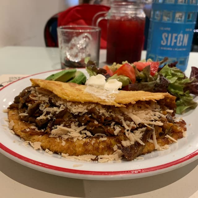 Cachapa de Girgolas y salteado de vegetales a la barbacoa, ensalada de lechuga, tomate, mango y palta muuy rico. es como un omelette. es re abdunante la porcion. podria mejorar agregandole queso derretido. super recomiendo