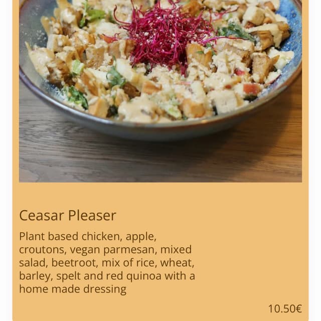 Yoooo why in the hell did I not come here earlier!! 🤩🤩 I’ll tell you why: Because my restaurant list is soooo long!! 🫠 This is an #allveganrestaurant !! 🎉🥳🥳 This #ceasarsalad was the least favorite one of the dishes. It was good but had a very strong taste, couldn’t put my finger on it, but it was too strong. This bowl has: #veganchicken , apple, #vegancheese , lettuce, #quinoa , beetroot, rice, croutons and a dressing. This was € 10,5 (small version) The reason we chose this restaurant to attend to this evening is because we’re trying to spend less and it’s so cheap here!! 😃 📌 Ate here May 6th 2025