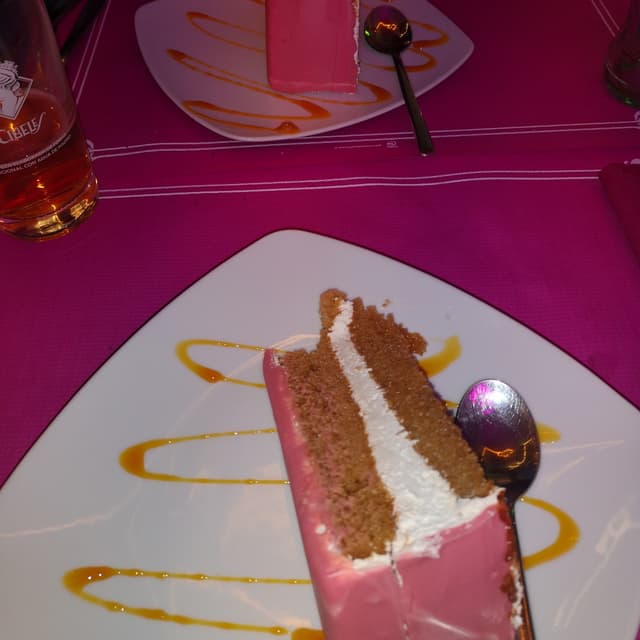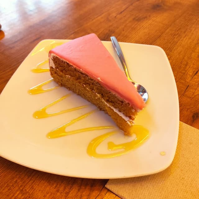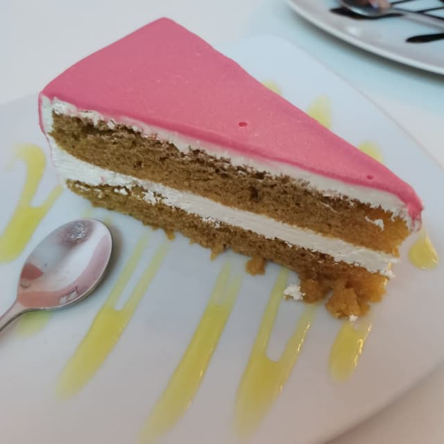 Muy rica. Bien equilibrada entre bizcocho y crema (nata). Cubierta de chocolate blanco.