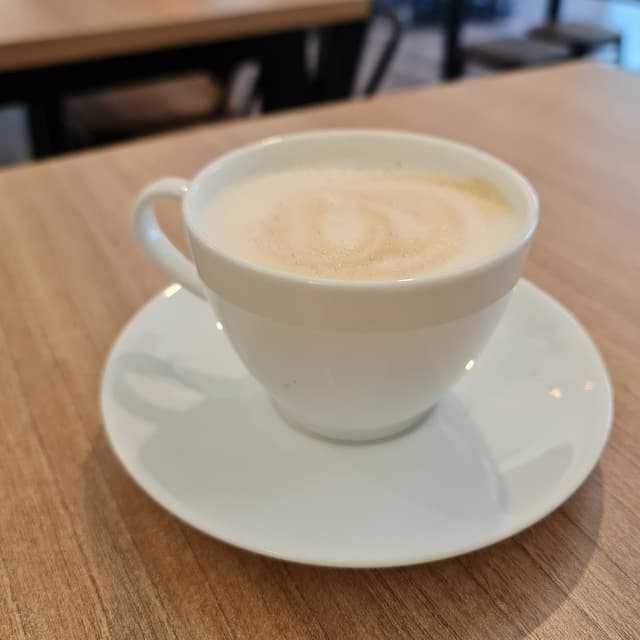 Oat milk by default! This coffee is unfortunately average but it is priced well at 3.8. The milk is quite thin, frothed up but not much bulk to it.