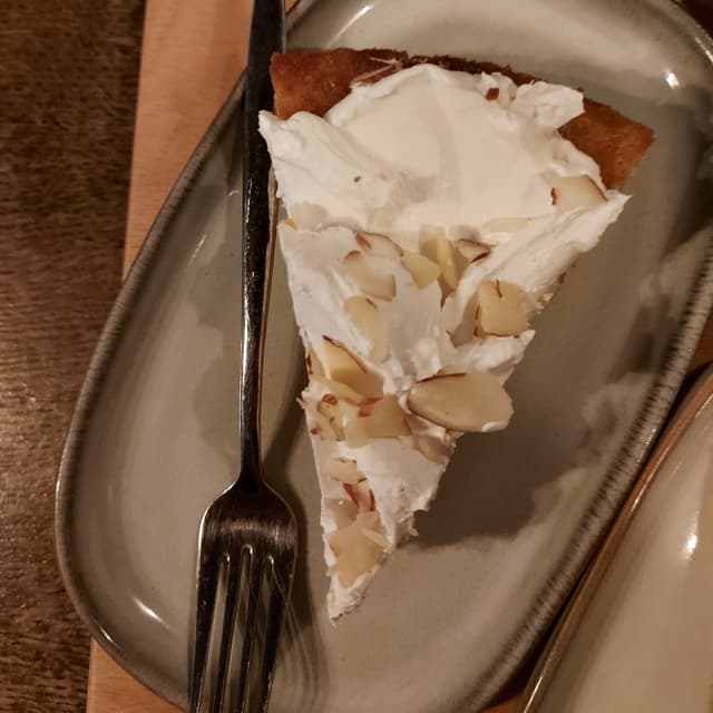 Fantastica. Gustosa. Panna buonissima e mandorle in scaglie per fuarnire. Buona fetta in proporzione quantità-prezzo