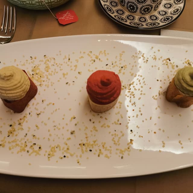 Se venite da Flora dovete provare questo piatto. Sono rimasta sbalordita: appena si apre il cartoccio si sprigiona un odore di pesce dato dalla combo alga dulse e lattuga di mare. Il cartoccio è fatto di ingredienti semplici: ceci, tofu, pomodorini, olive. È accompagnato da una maionese e una salsina ai peperoni che onestamente ho mangiato a parte col pane perché il cartoccio si gusta benissimo senza bisogno di aggiungere altro. Costa 14 euro alla carta con possibilità di selezionarlo come secondo nel menù degustazione a 31 euro.