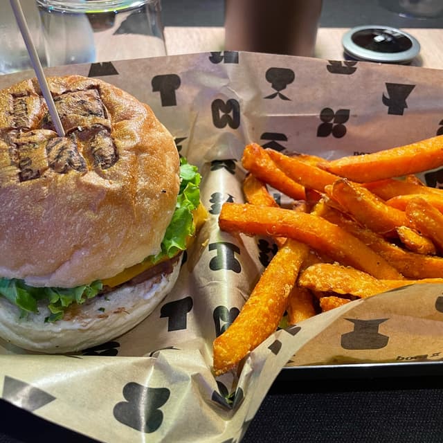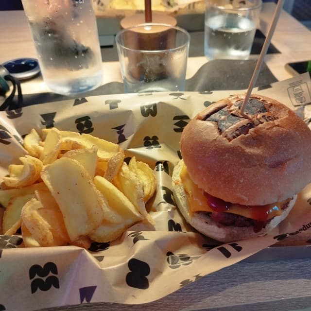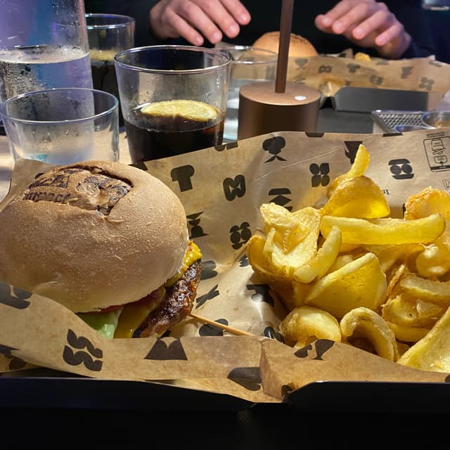 Ottimo burger con redefine meet, consistenza e sapore spettacolari! Con pomodori, insalata, salsa con erba cipollina e cheddar. Panino e patatine prezzo 12 (+2,50€ se si sceglie il burger con redefine meet).