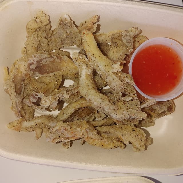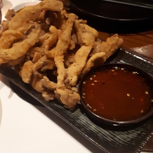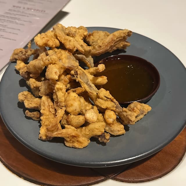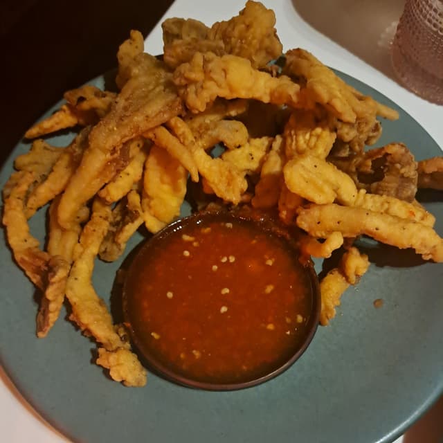 Really tasty side dish at this vegan restaurant. Crispy fried mushrooms, perfectly cooked with a tangy and sharp sweet chilli sauce.
