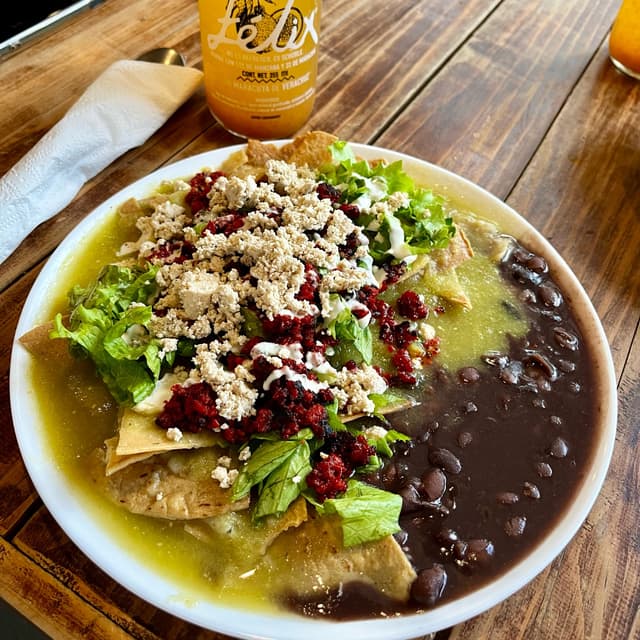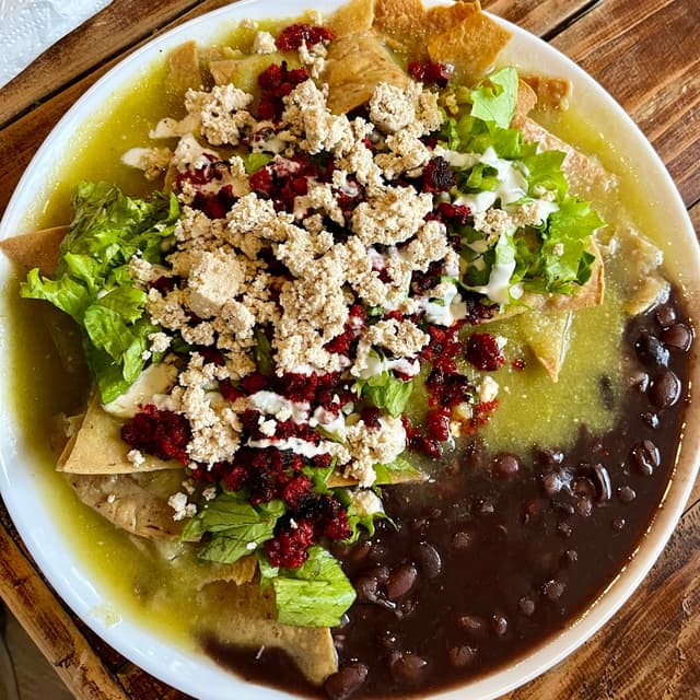 Otro platillo que siempre encontrarás en el menú son estos chilaquiles verdes con chorizo de soya. La salsa pica un poco pero no exagerado, el queso es de tofu, la lechuga les da buen sabor y los frijoles de la olla son muy buen complemento. Puedes disfrutarlos en la comida o cena. Súper recomendables 😋🤤 #veganisnotscary #comidavegana #veganchilaquiles #tofulover #bekind 🎃🕸️🧙♀️🧟♀️