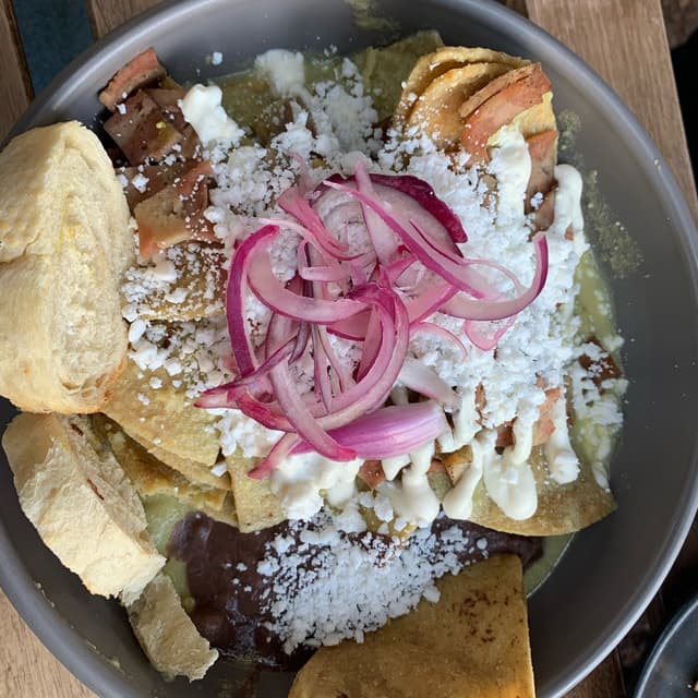 Son los chilaquiles verdes más ricos que he probado en mi vida ♡. La porción está muy bien. Chilaquiles + frijoles = combinación perfecta. Los pedí con “tocino” que también me gustó mucho. #chilaquiles #comidamexicana #plantbased