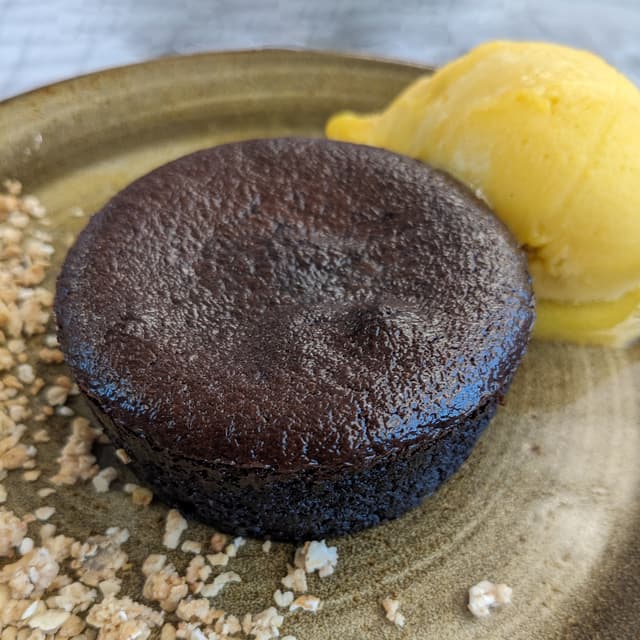 Tortino vegano al cioccolato fondente accompagnato da muesli croccante e da una pallina di gelato al mango, unico gusto disponibile senza latte. 🍫 Il tortino è molto morbido e dolce, buono anche il muesli e l'abbinamento con il mango è perfetto! Un dessert ottimo per concludere il pasto! 😋 #chocoholic #veganchocolate #mango #veganicecream #dairyfreeicecream #muesli #vegandessert #darkchocolate #veganin2023 #govegan #veganfood #alicantevegan #alicante
