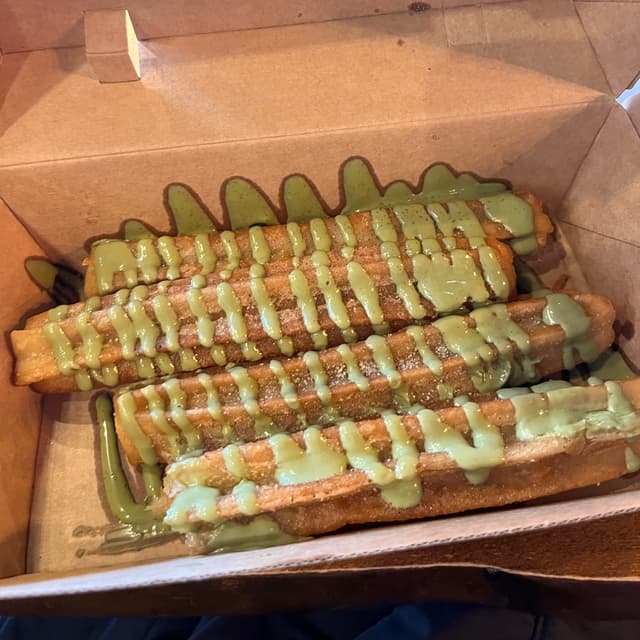 coradvil11 months agoSee TranslationLos churros son lo que te puedes esperar, bastante aceitosillos pero crujientes. Están ricos. La crema de pistacho es una especie de chocolate blanco bastante suave.0