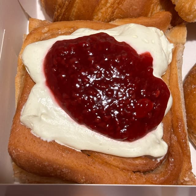 cinnamon roll con crema chantilly e lampone. delizioso e soffice, con la cannella ci sta da dio :)