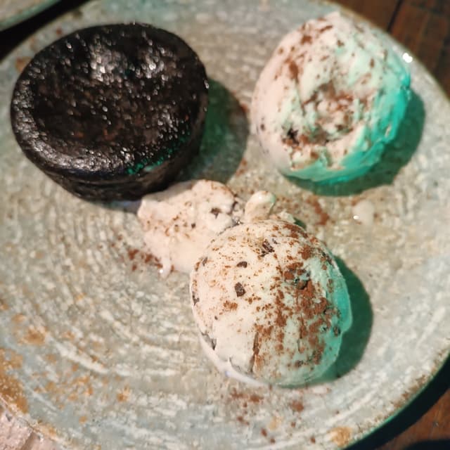 Coulant de chocolate. Viene acompañado de dos bolas de helado a escoger entre vainilla, chocolate o stratiachella.
