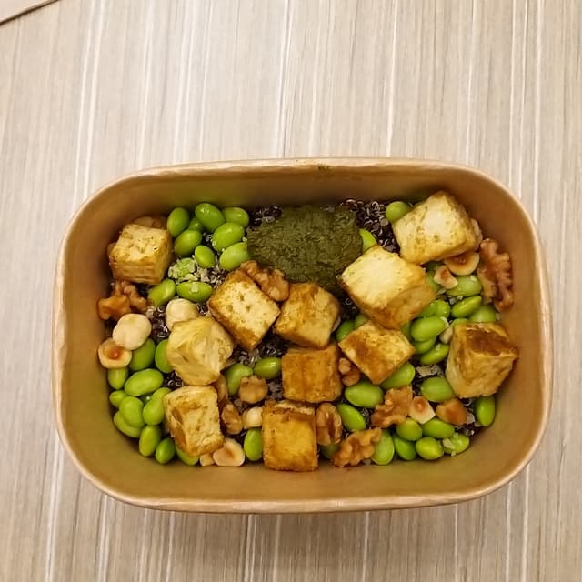 Craft your own bowl - love bowl im so so sad Ahimsa has changed their menu and increased prices 😭😭😭 1 base - lemon herbed quinoa 1 protein - CCF tofu 1 veggie - edamame 2 toppings - walnuts, roasted hazelnuts 1 dressing - moringa cashew pesto yummy, but it tastes like what it sounds, nothing spectacular, wouldnt pay $10.90 #ahimsa #nuseats #kentridge #craftyourownbowl
