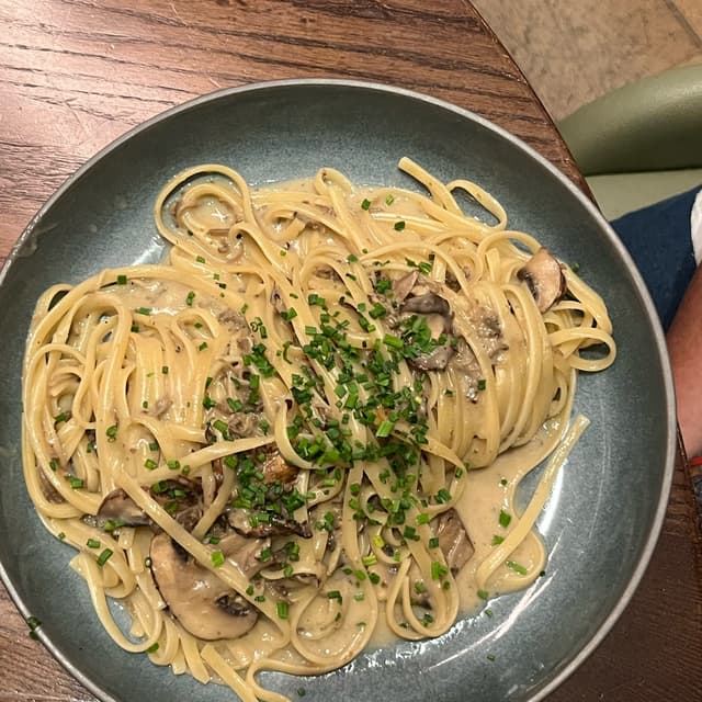 Restaurant 100% vegan, moderne, il propose des plats originaux et d’autre plus classiques. Pour mon 1er essai j’ai opté pour les pâtes à la crème de champignons. Pour la sauce, les champignons ont été cuits dans du lait/creme d’avoine avec de l’ail. Très bon plat.