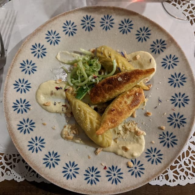 Culurgiones vegani: patate, “vrana” e pepe, il tutto accompagnato da una crema di nocciole e porri con puntarelle e fiori eduli. Anche qui ho "scarpettato" alla grande!