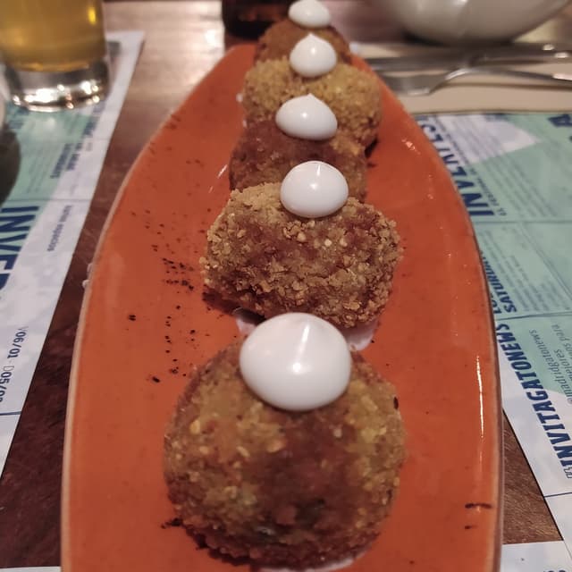 Te ponen de dos variedades: unas de chorizo y las otras creo que de setas. Me parecieron muy ricas. Estaban crujientes por fuera y muy melosas y suaves por dentro. Repetiré.