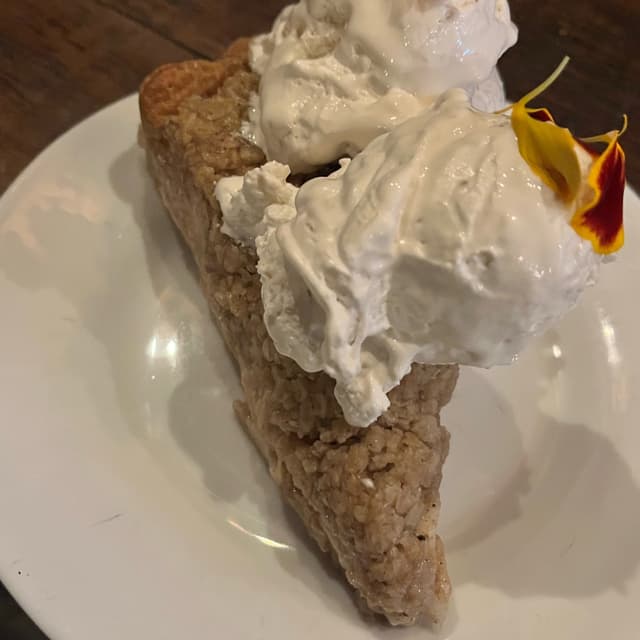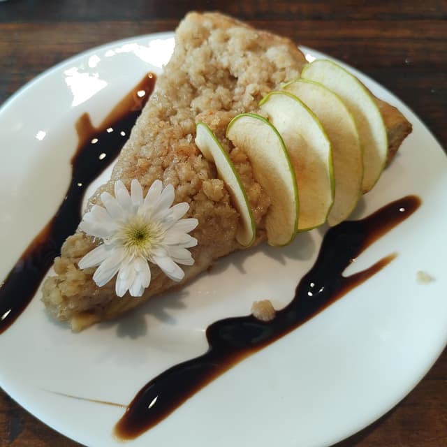 Perdón la foto, no es la mejor. Pero el crumble de manzana fue lo mejor que probé. Agradezco que estaba en duda que pedir y el mesero me recomendó este junto a 2 bochas de helado vegano. El crumble sin palabras. Si vas, tenes que pedirlo. Riquísimo y porción abundante. La textura muy de crumble y el sabor de manzana y dulce justo, junto al helado. Lo re volvería a pedir. Mi viejo se pidió flan con ddl e igual que este, muuuuy bien logrado y rico! Aunque soy más crumble person.
