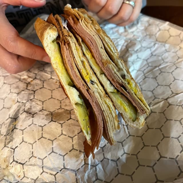 i’m reviewing this again because it was suggested to add smashed maduros and garlic aioli for the sandwich for a dollar extra and it was definitely a good idea! they added a lot of texture and extra flavor; additionally, the garlic aioli made the sandwich a bit creamier and provided a nice contrast to the meat of the sandwich. the sandwich itself is very large and the deli meats are delicious! i can tell the difference between the two and they both have distinct flavors. i enjoy the mustard and pickles as well, and the bread (truly) brings the sandwich together. i loved this one, definitely recommend adding to it! #cubansandwich #cuban #sandwich #vegansandwich #vegandeli #deli
