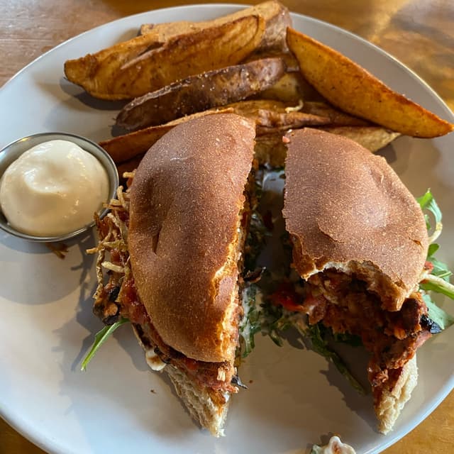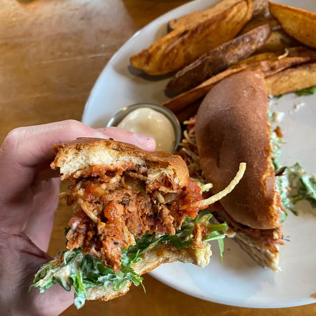 I really enjoyed this special burger from Reverie! The chorizo-spiced patty was a monster! The "spicy red relish" really just seemed like a mild salsa to me, but I still loved how it played with the aioli and the rest of the burger. And I really loved the addition of the shoestring potatoes. They added a perfect crunch to every bite. I went for their new Burger Monday special where you get a burger and drink for $15! #burger #veganmeat #salsa