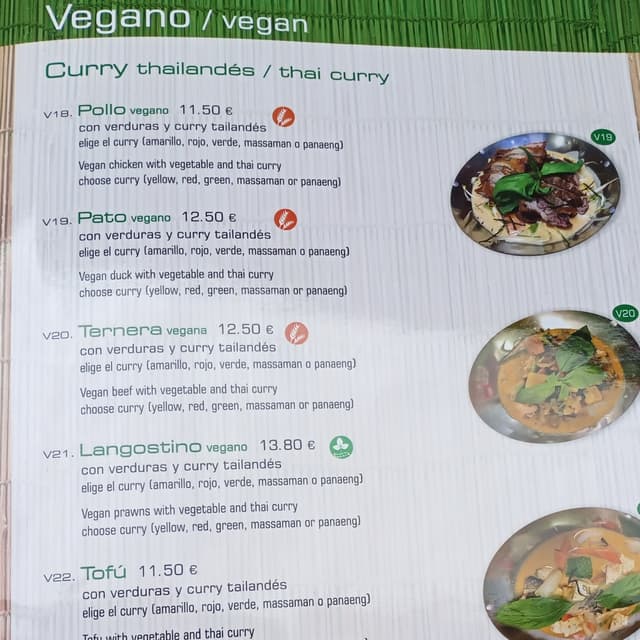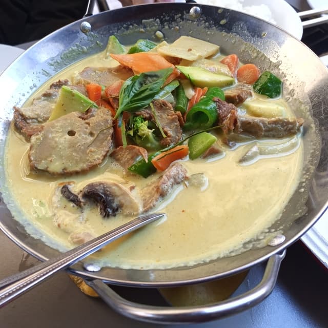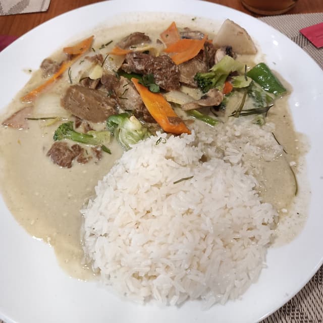 Tomamos el menú del día y había bastante cantidad de comida. De primero, tomé pad Thai con no pollo y de segundo, el curry verde. Estás muy rico de sabor, pero fue bastante decepción que tanto el pollo vegano como el pato vegano (y supongo el resto de carnes vegetales) son simplemente seitán.,. De haberlo sabido, hubiese pedido otras cosas para variar y no comer un primero y un segundo tan parecidos. El pudin de mando es básicamente gelatina de mango. El curry verde sí que vale mucho la pena!!!