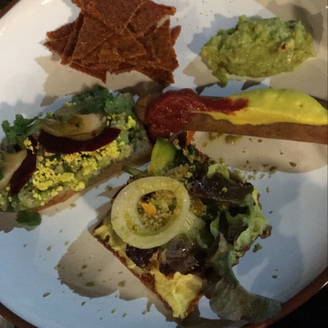 Guacamole con nachos, salchicha veggie, tartin de “atún”, tiradito de tofu y brusqueta raw de girasol y tomate. #santuariosalvajes