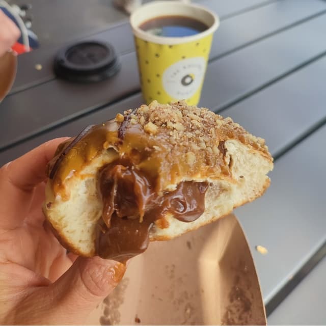 Uno dei più buoni tra i 6 donuts provati da The Rolling Donut! È ripieno di crema al caffè e ricoperto con glassa al caffè e noci tritate. Il ripieno è super abbondante come si vede dalla foto. Consigliato anche se non si è fan sfegatati del sapore del caffè perché pur essendo l'ingrediente principale è comunque delicato. Avrei preferito trovate un po' di noci anche nel ripieno perché erano solo su una parte della superficie. Costo 3,30 euro.