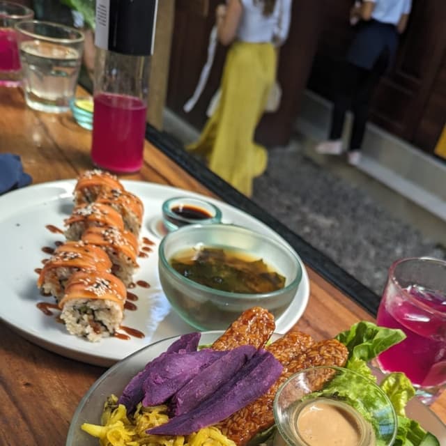 For a vegan-curious person, Sariyu is the gold standard for AMAZING vegan food. We haul back the cashew cheese all the time. :) Brown rice sushi roll filled with smoked papaya salmon, teriyaki tempeh (S,G), cashew cream cheese, cucumber pickle and avocado, atop with papaya slice with wasabi sauce & teriyaki sauce, served with miso soup (S) pickled ginger and soy sauce (S)(G) IDR 79K!!!