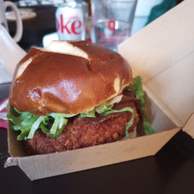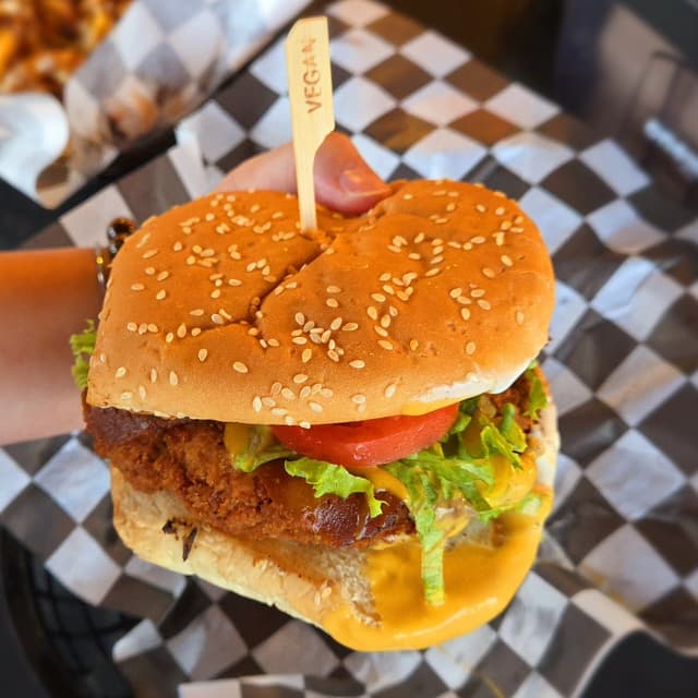 Perfectly crispy on the outside, tender on the inside seitan chickun patty with tomato, lettuce, seitan bacun and a house made ranch. My absolute favorite sandwich from this wonderful vegan delu